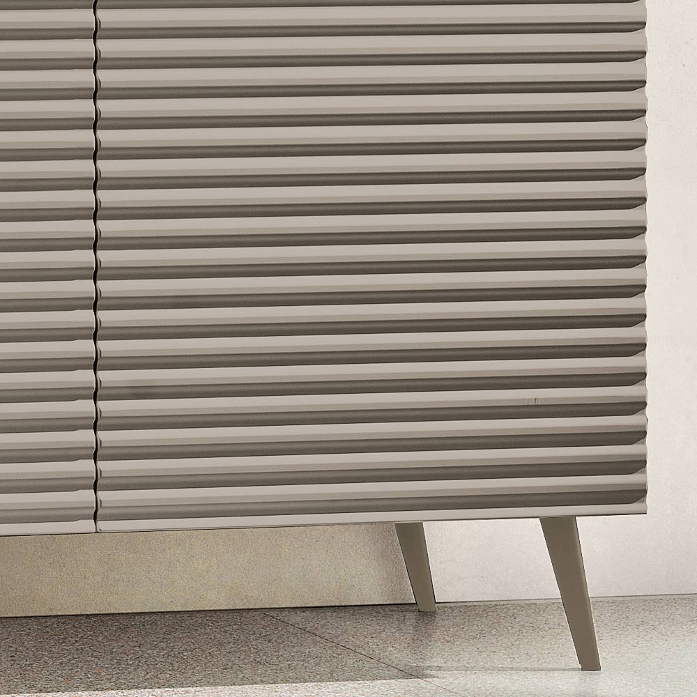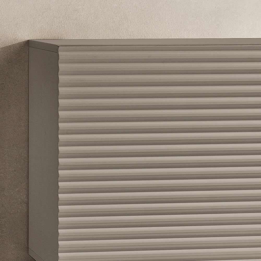 Die PVC-beschichteten MDF-Türen weisen ein erhabenes, horizontales Streifenmuster auf, das der Oberfläche Tiefe und Dynamik verleiht und einen eleganten grafischen Effekt erzeugt. Der dazu passende Korpus aus Melamin rundet das Design mit einem raffinierten Ton-in-Ton -Effekt ab und sorgt so für eine harmonische und moderne Komposition.