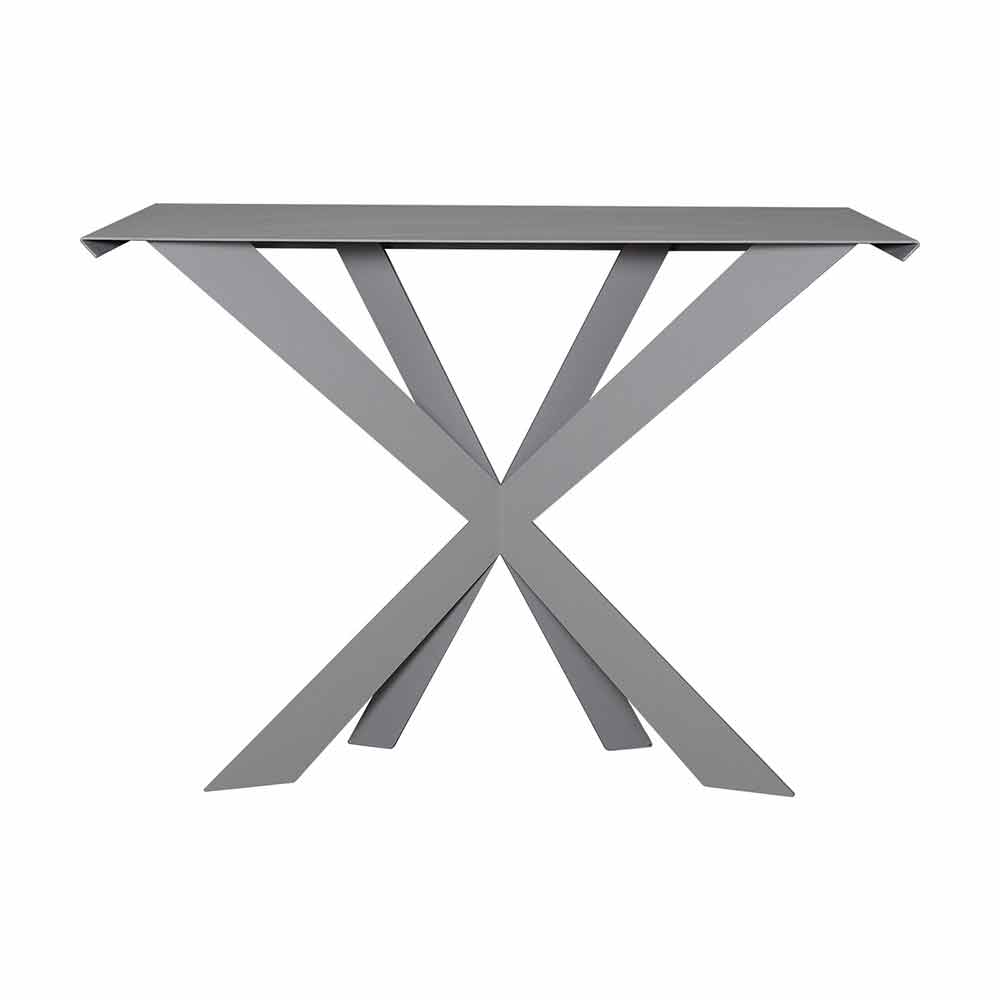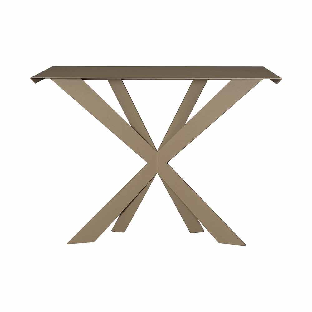 Zecchina ist eine stabile Wohn- oder Eingangskonsole, die sich durch regelmäßige und asymmetrische Beine auszeichnet, die sich kreuzen und ein "X" bilden. In Italien in Eisen handgefertigt .
