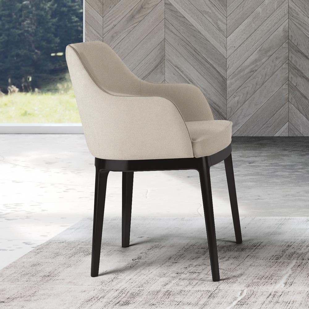 Sessel in modernem Design mit Sitzschale aus massivem Buchenholz und gepolstertem Sitz aus Stoff. Ein Einrichtungsaccessoire, das sich problemlos an jeden stilistischen Kontext anpasst, in den es eingefügt wird, und dabei hilft, eine einzigartige und stilvolle Atmosphäre zu schaffen. Die ästhetische Leichtigkeit, die sein Design auszeichnet, macht es perfekt für die Vervollständigung von Wohnräumen wie Esszimmern und Küchen, aber auch Objektbereichen wie Bars und Restaurants, die durch seine einfachen und raffinierten Formen Persönlichkeit verleihen. Das Produkt ist Teil der neuen Linie moderner Produkte, die mit Respekt vor der Natur hergestellt werden.