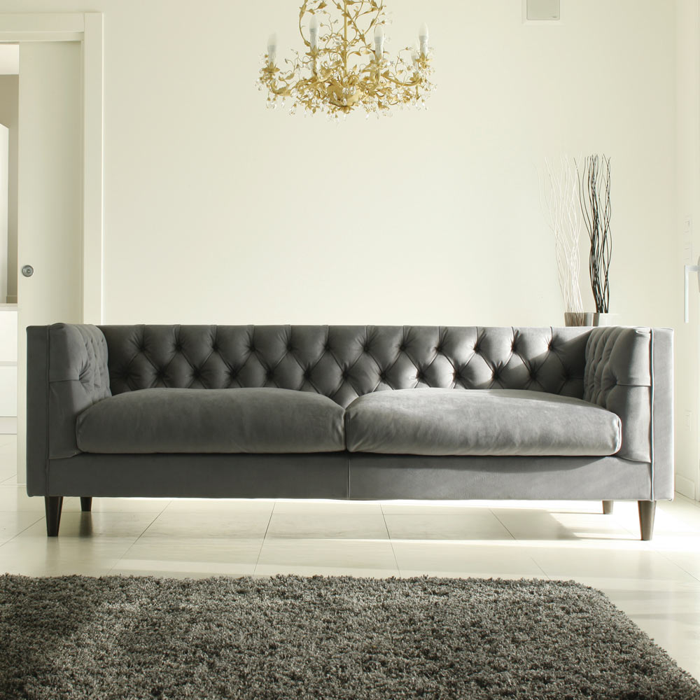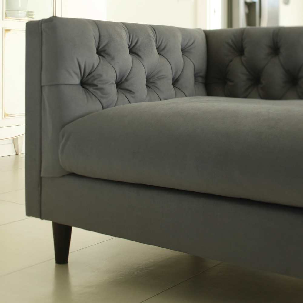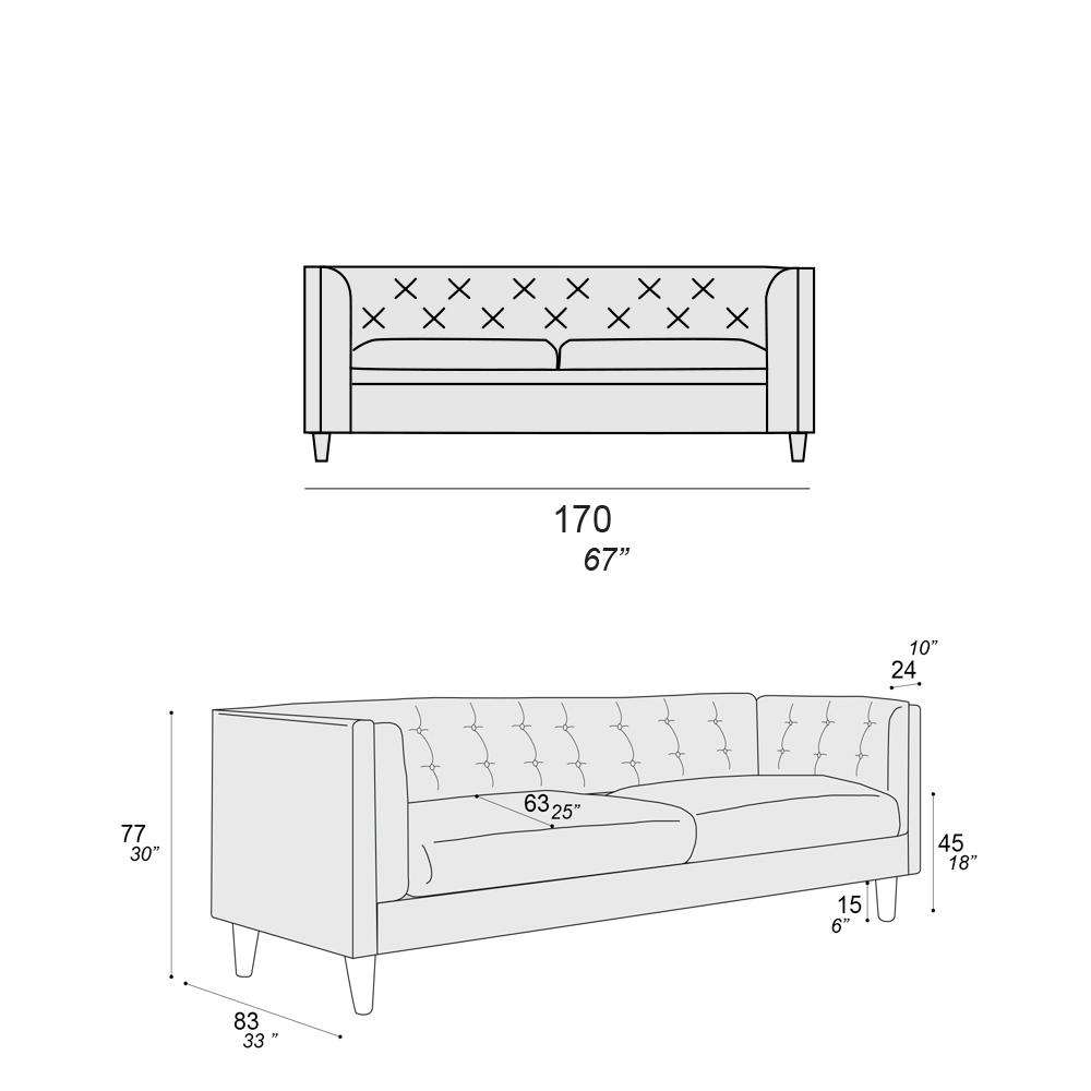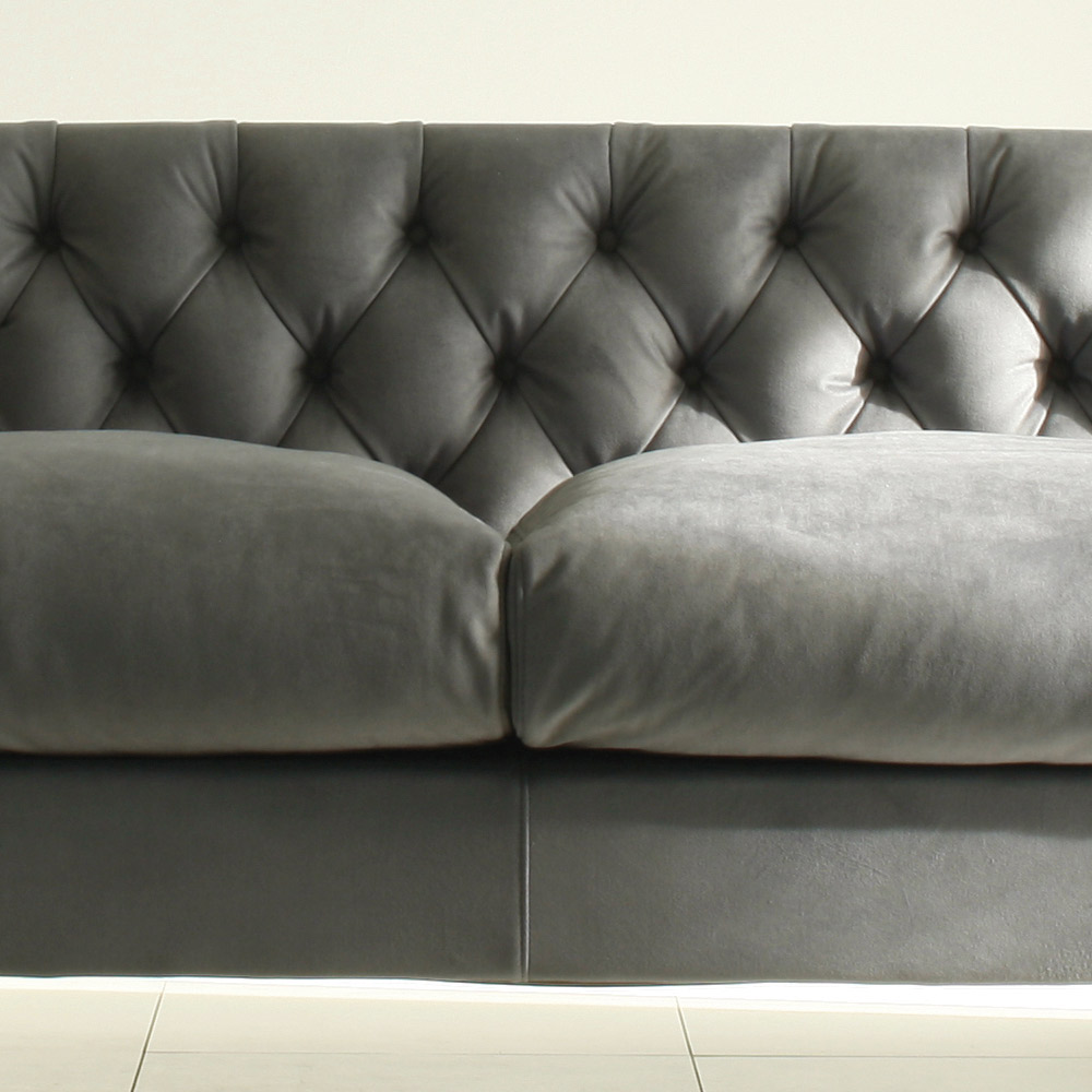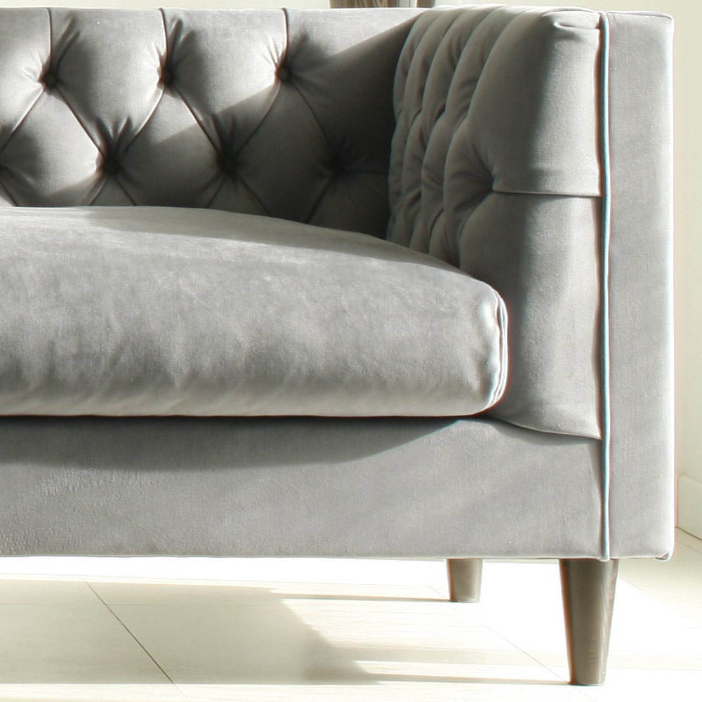 Buchenholz. Das Sofa verbindet Klassik mit einem modernen und raffinierten Look. Seine geknöpfte Polsterung und die abgerundeten Armlehnen strahlen Eleganz aus, während der Holzrahmen und die großzügige Polsterung für Komfort sorgen. Die hochwertige Polsterung, die in verschiedenen Farben erhältlich ist, bereichert das Aussehen des Sofas. Die dünnen Holzbeine verleihen einen zeitgenössischen Touch, wodurch das Sofa sowohl für traditionelle als auch für moderne Innenräume geeignet ist und ihm eine gemütliche und anspruchsvolle Atmosphäre verleiht.