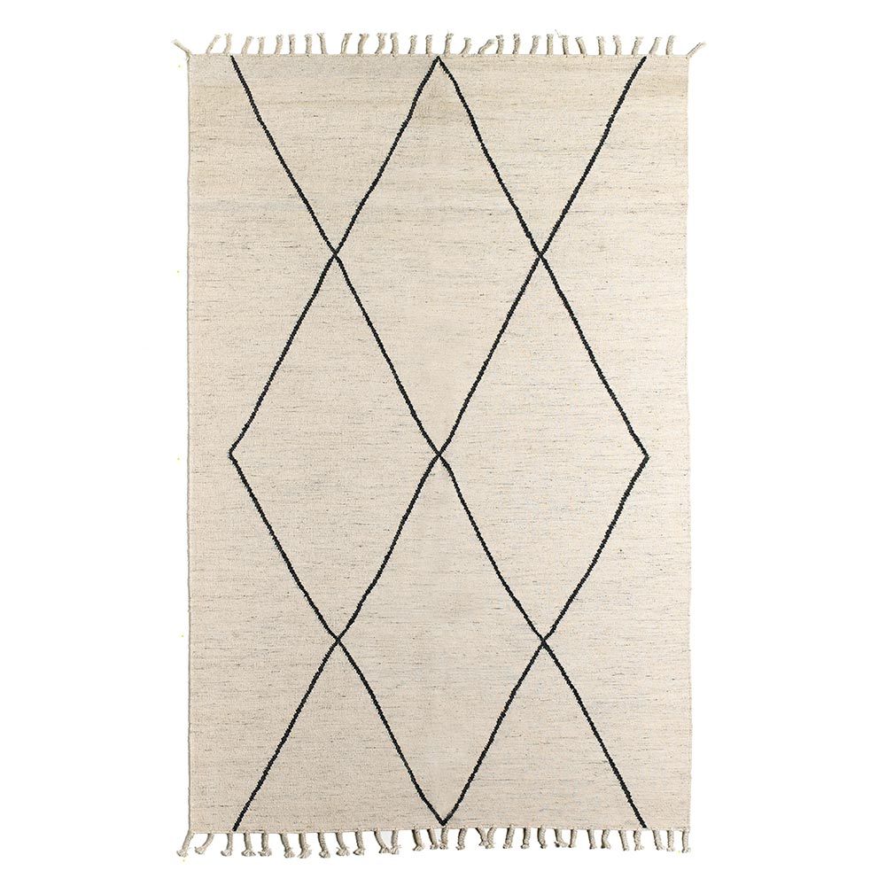 Dieser Teppich besteht aus Wolle und Baumwolle und wird " Kelim " oder ein haarloser Teppich genannt, der nicht geknotet, sondern von erfahrenen Webern handgewebt wird. Im Vergleich zu einem klassischen Teppich ist er leichter und weniger vollmundig und eignet sich perfekt als Dekorationsgegenstand, um das Dekor eines jeden Raums zu bereichern. Was das Produkt besonders auszeichnet, ist das geometrische Muster in Schwarztönen, das zusammen mit den Rändern, die die beiden kürzeren Seiten des Teppichs bedecken, Modernität verleiht. Die verwendeten Materialien und Techniken ermöglichen es, ein qualitativ hochwertiges Endprodukt zu erhalten, das die Aufmerksamkeit auf sich ziehen kann und jede Umgebung einzigartig macht.