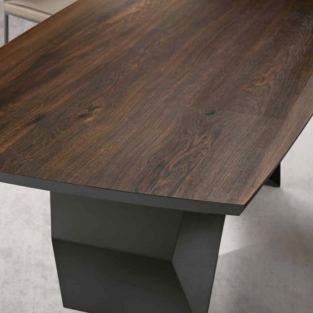 Die Metallbeine mit ihrer markanten, geometrischen Form sind lackiert und bilden einen schönen Kontrast zum Holzton. Diese Materialkombination sorgt nicht nur für solide Stabilität, sondern ist auch ein eindrucksvolles optisches Element, das diesen Tisch zu einem echten Blickfang in jedem Esszimmer oder offenen Bereich macht.