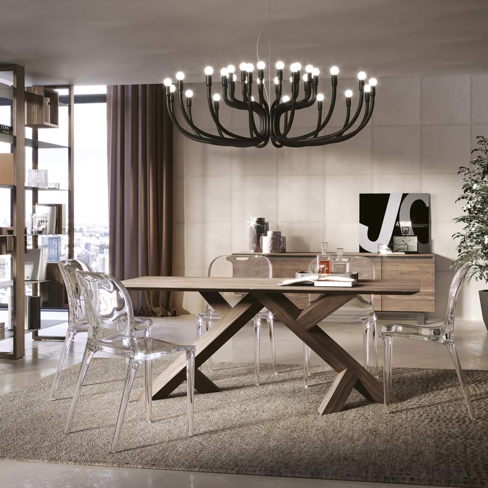 Indoor-Tisch mit Platte aus massivem Nussbaum geknotet mit natürlichen Farbtönen, die in verschiedenen Kanten erhältlich sind. Die Basis besteht aus zwei Massivholzbeinen . Das Produkt wird vollständig in der Toskana hergestellt , unter Verwendung hochwertiger Materialien und vor allem unter Berücksichtigung der Umweltauswirkungen , der Arbeit mit natürlichen Materialien und der Verwendung ungiftiger Produkte . Die Möglichkeit der Verlängerung ist durch Edelstahlführungen gegeben, die ein leichtes Öffnen ermöglichen.
