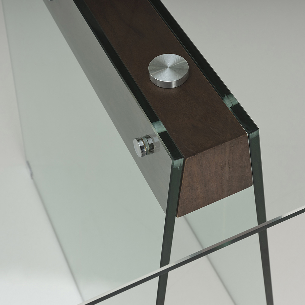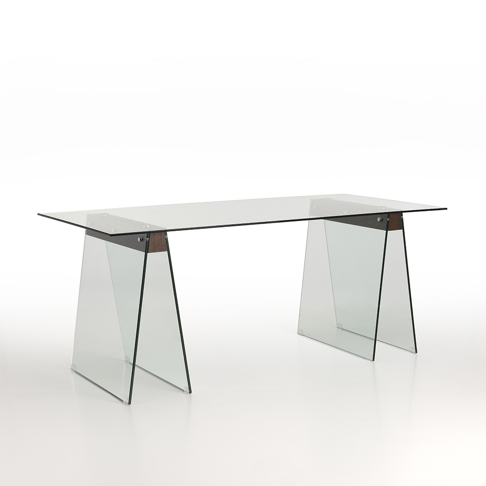 Losanna ist ein Tisch im modernen Stil mit Beinen aus Klarglas und einer 12 mm dicken Klarglasplatte mit Einsätzen aus walnussfarbenem MDF.