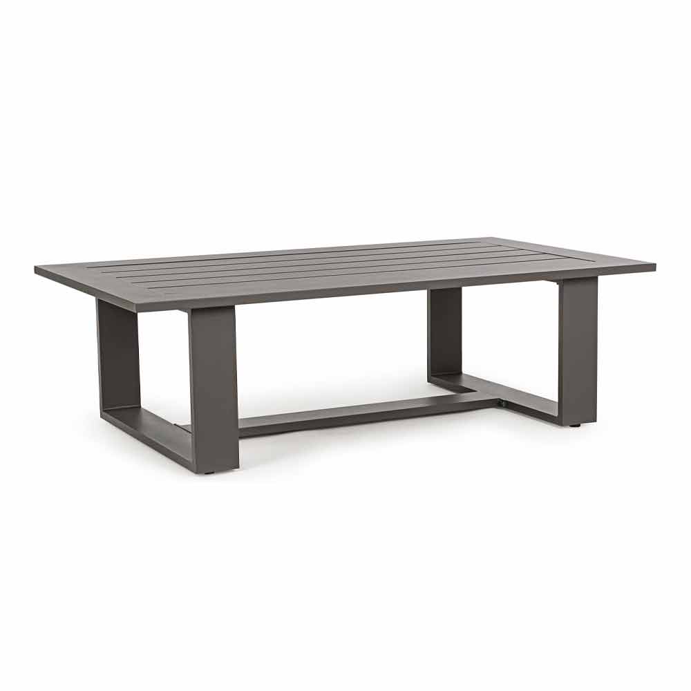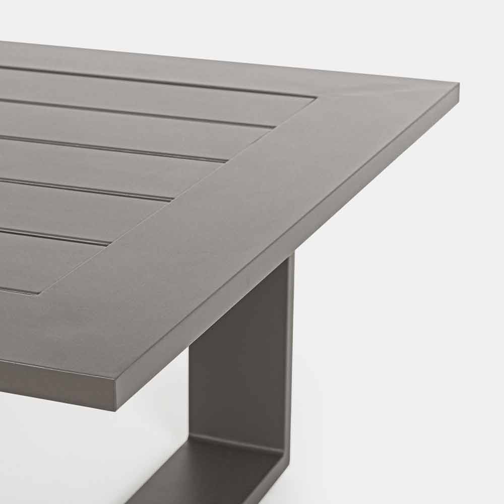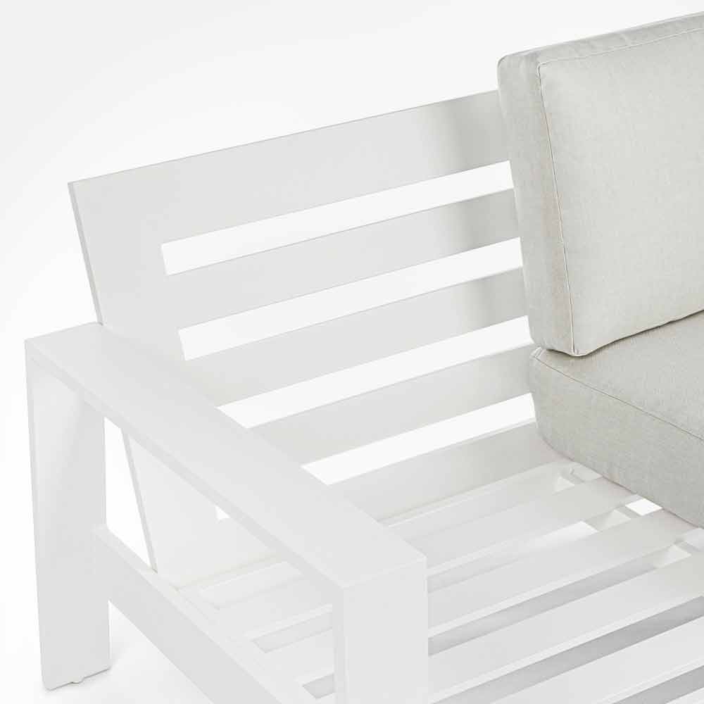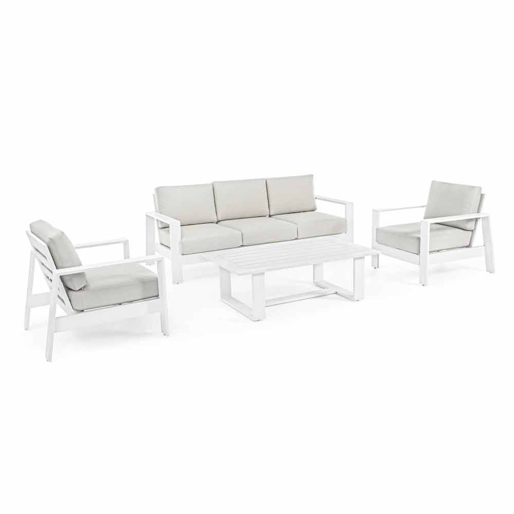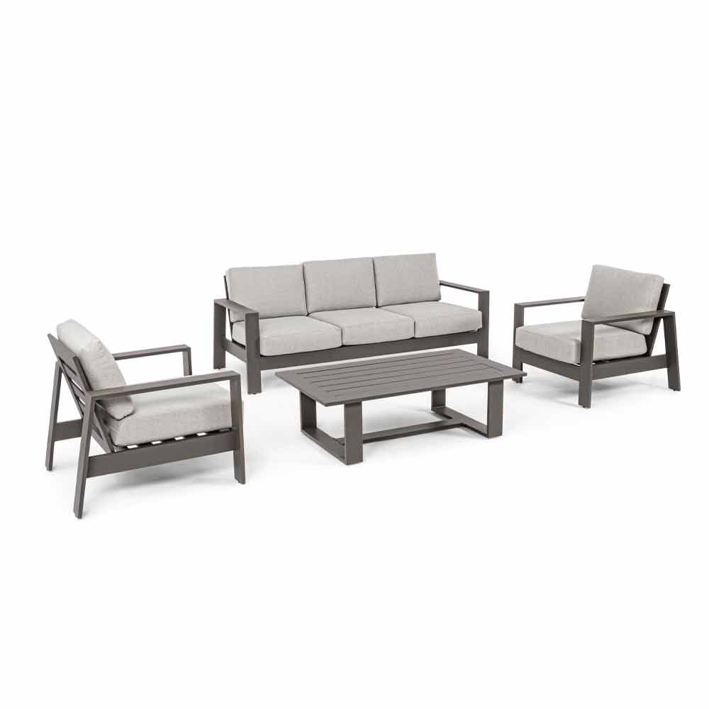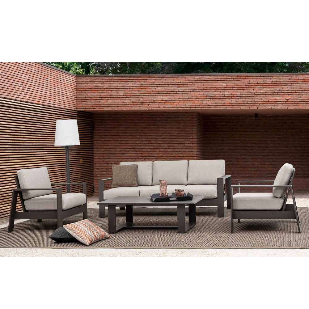 Lounge im Freien mit Sofa, Sesseln und Couchtisch aus Aluminium.