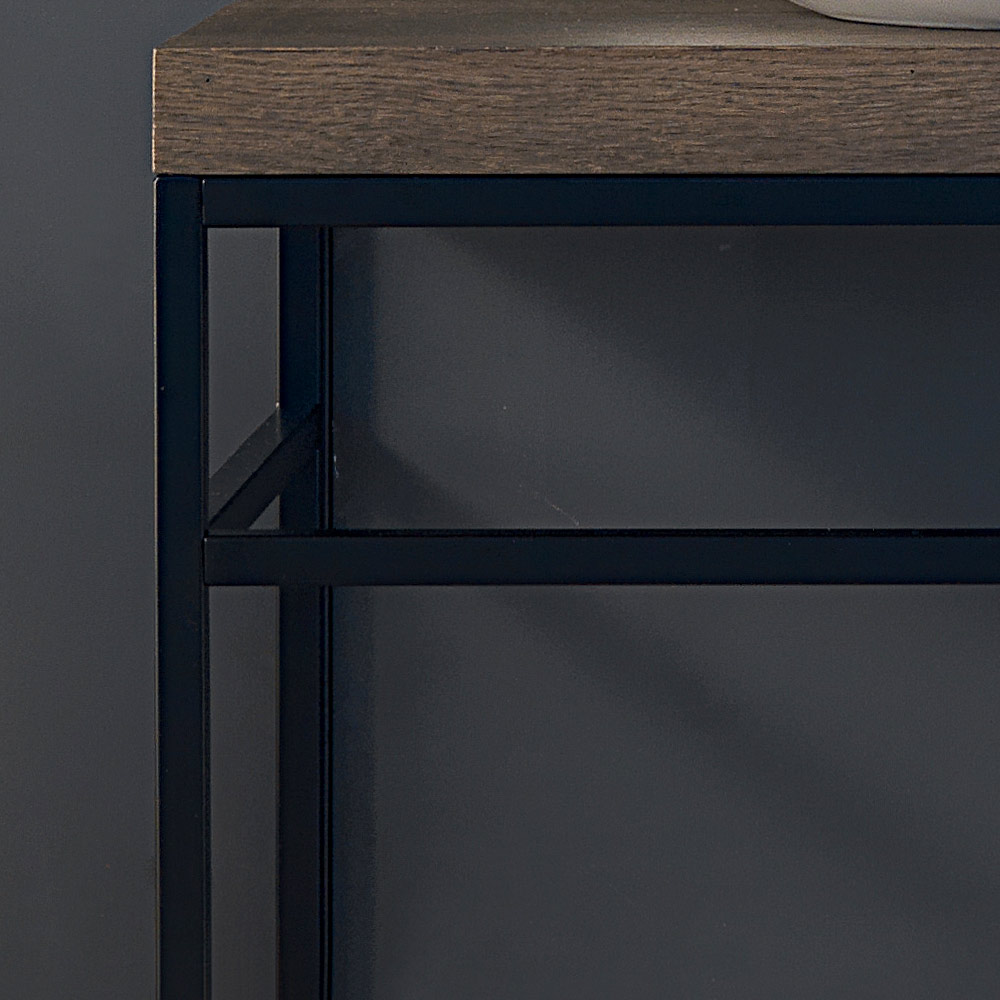 im industriellen Stil schafft. Diese elegante Komposition umfasst einen offenen Waschtischunterbau mit Handtuchhalter und Spiegel.