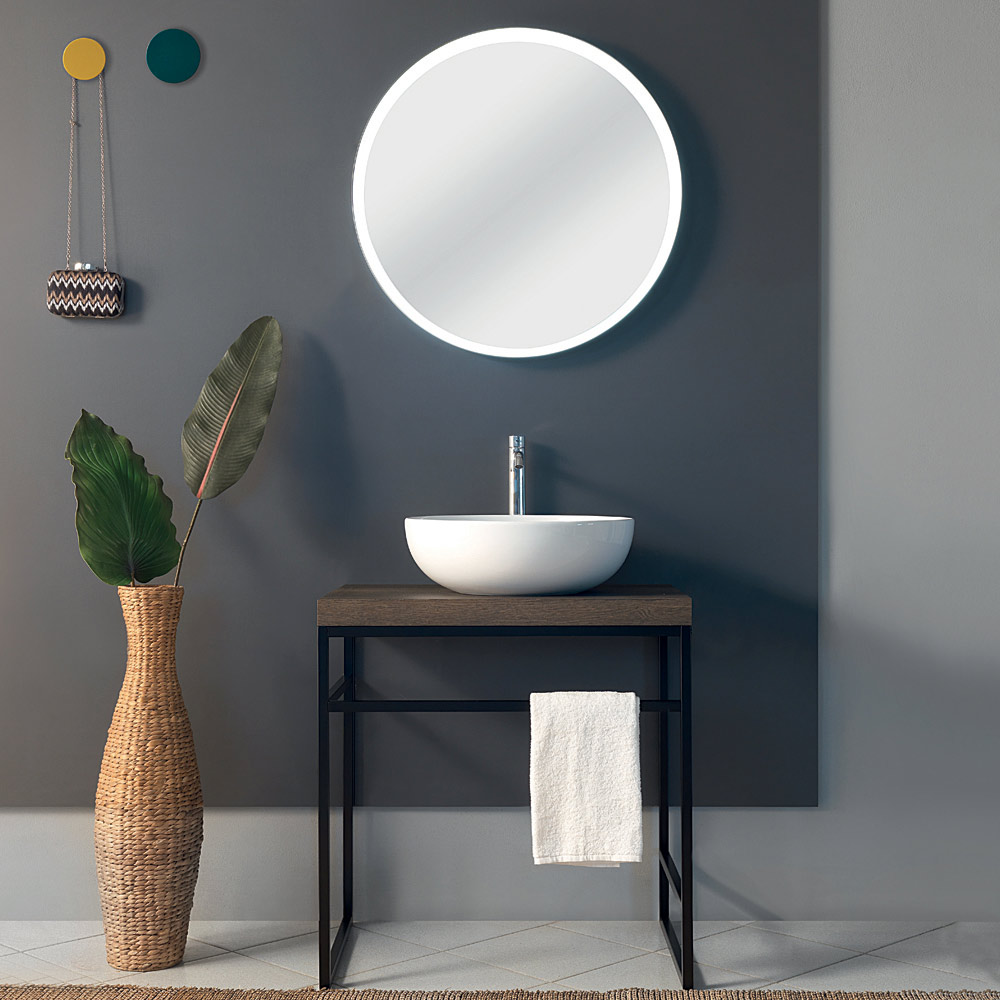 Badmöbellinie zeichnet sich durch eine Struktur aus einem dünnen mattschwarz lackierten Metallprofil aus, die eine harmonische Kombination aus vollen und leeren Räumen