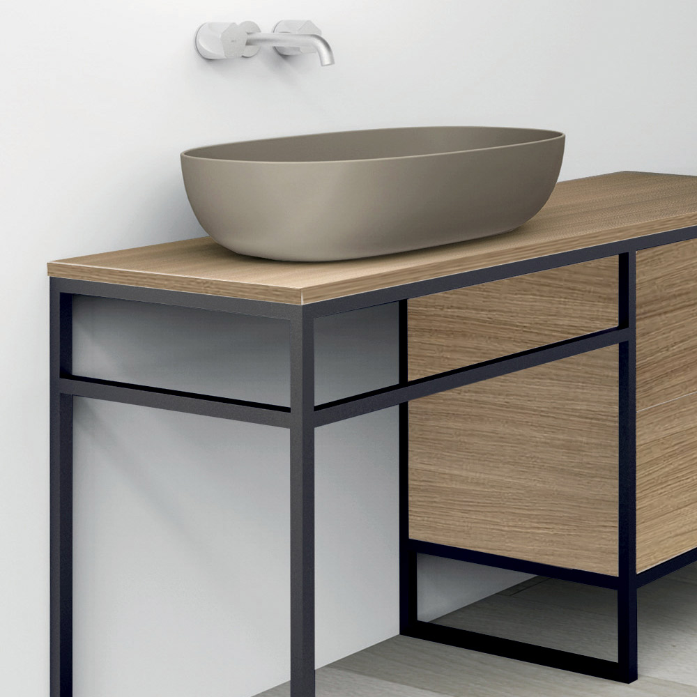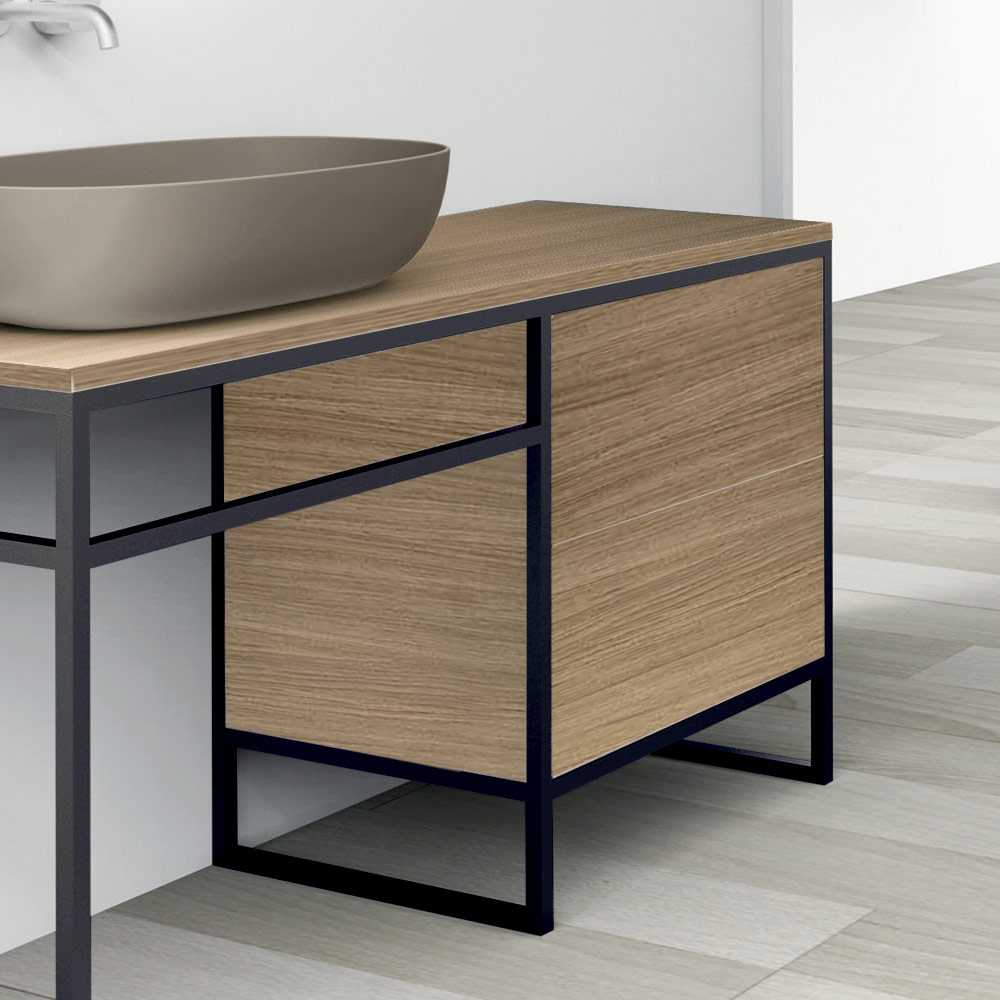 Badmöbellinie zeichnet sich durch eine Struktur aus einem dünnen mattschwarz lackierten Metallprofil aus, das die Türen aus Eichen-Ökoholz einrahmt und eine harmonische Kombination aus vollen und leeren Räumen schafft. Die Metalloberflächen der Türen unterstreichen den