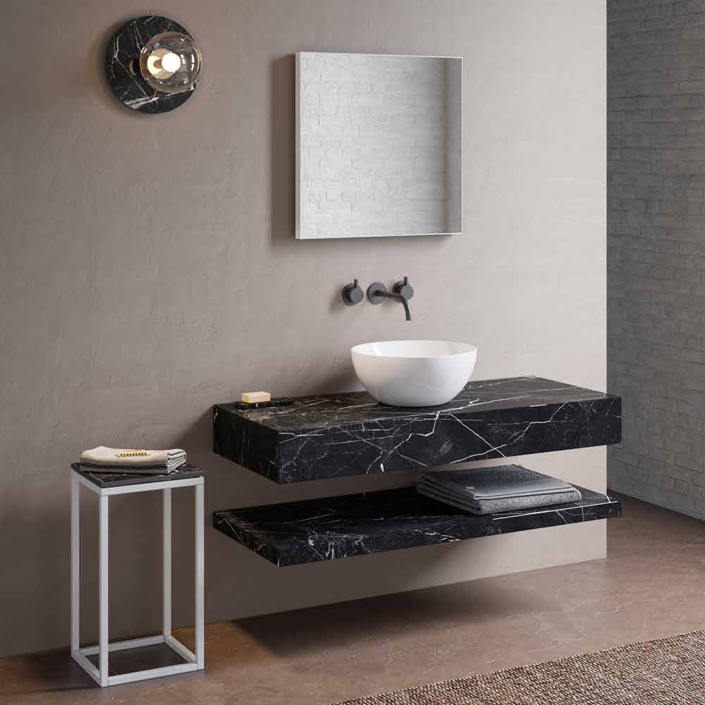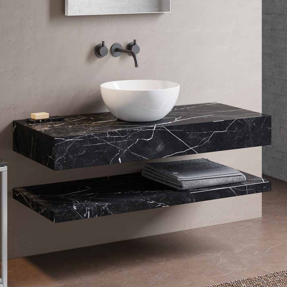 Die Hängekonsole und das Regal sind aus Feinsteinzeug in 4 Ausführungen erhältlich.
