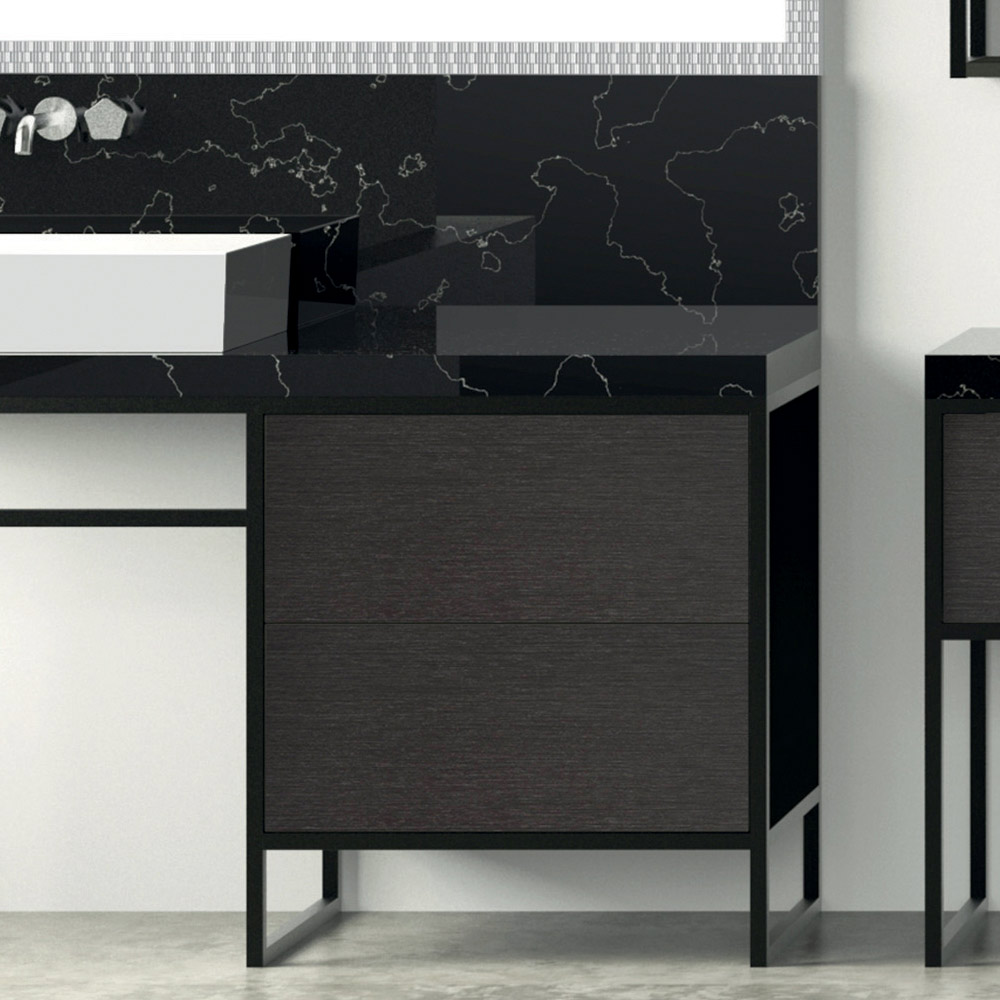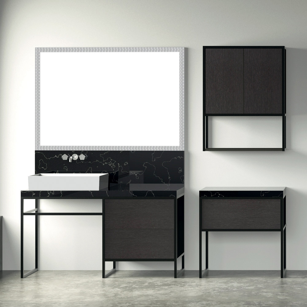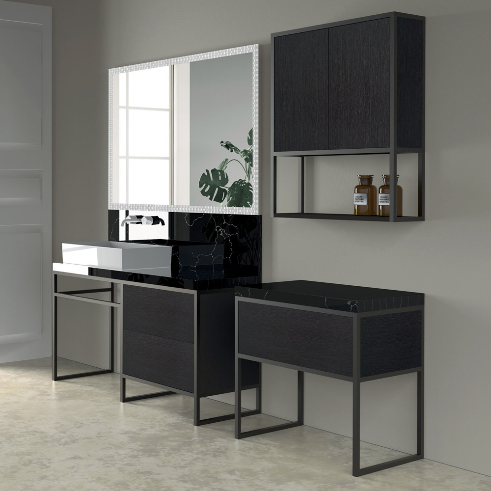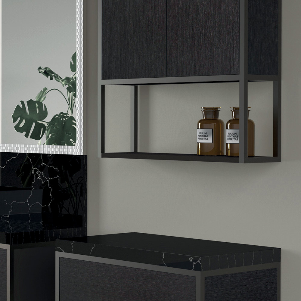 Badmöbellinie zeichnet sich durch eine Struktur aus einem dünnen mattschwarz lackierten Metallprofil aus, das die schwarzen Metalltüren aus Ökoholz einrahmt und eine harmonische Kombination aus vollen und leeren Räumen schafft. Die Metalloberflächen der Türen unterstreichen den