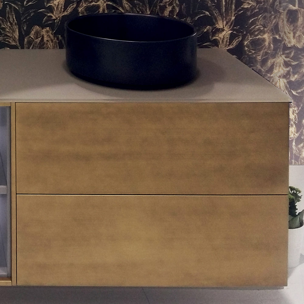 doppelte Aufsatzwaschtische aus anthrazitgrauem Stonelight-Harz. Diese ruhen auf einer