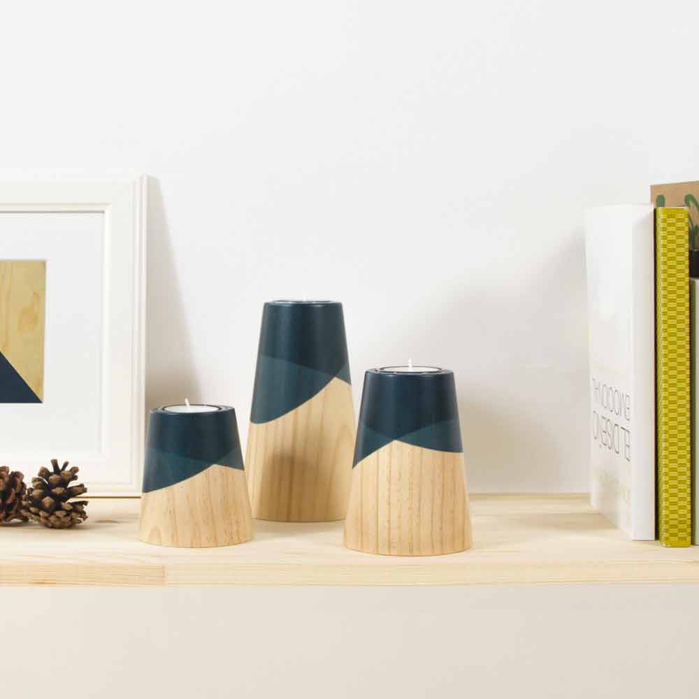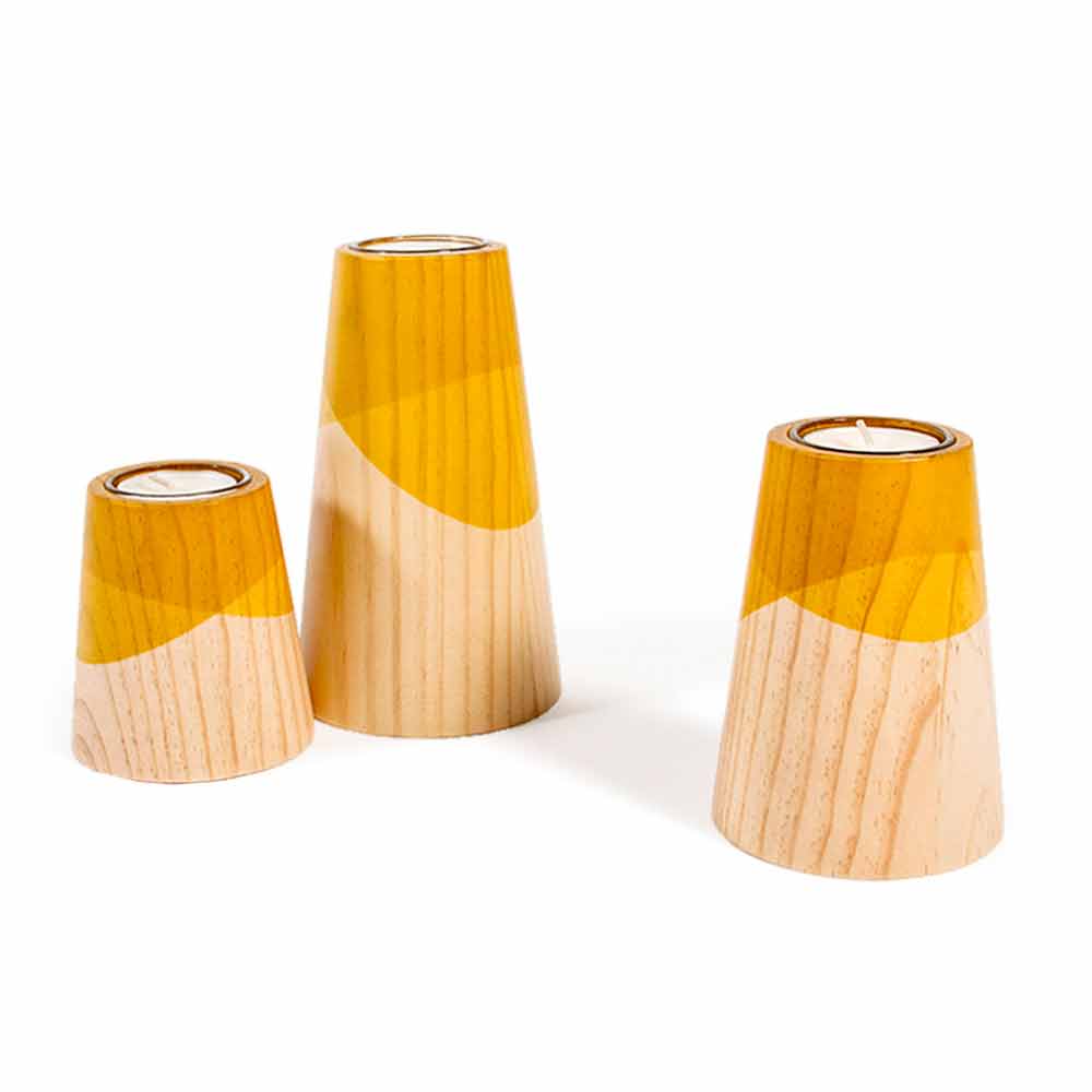 Zusammensetzung aus 3 konisch geformten Kerzenhaltern aus massivem Kiefernholz, die mit einem Hauch von undurchsichtiger Farbe verziert sind, die die Maserung des Holzes sichtbar macht und so eine Hervorhebung ermöglicht. Oben befindet sich auch eine kleine Glasschale, mit der Sie die Kerze platzieren können, ohne die Holzstruktur zu beschädigen.