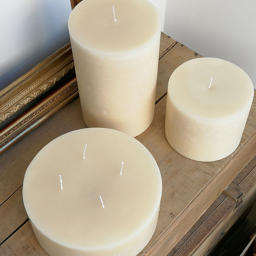 Moderne Komposition mit drei Wachskerzen in verschiedenen Größen,