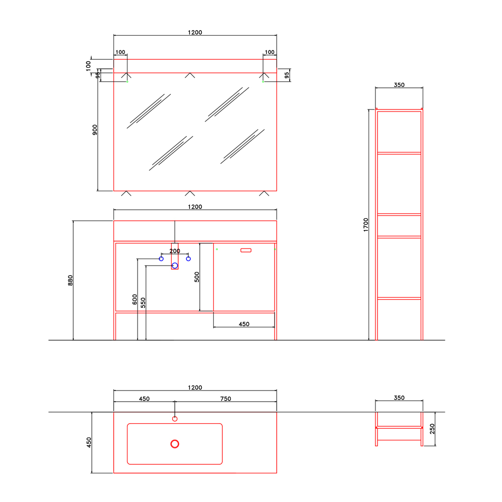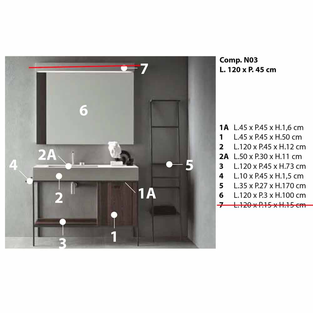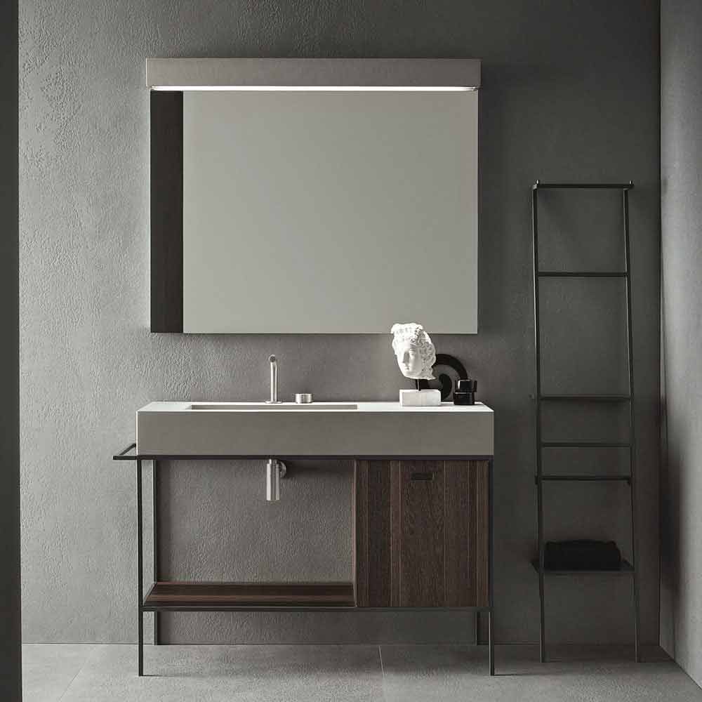 Diese Zusammensetzung besteht aus wärmebehandelter Eiche , Waschbecken aus hellgrauem Zementharz; Bock und Leiter für Gegenstände in mattem dunkelgrauem Lack.