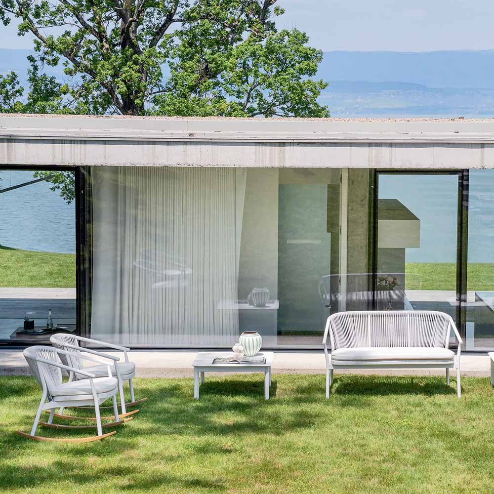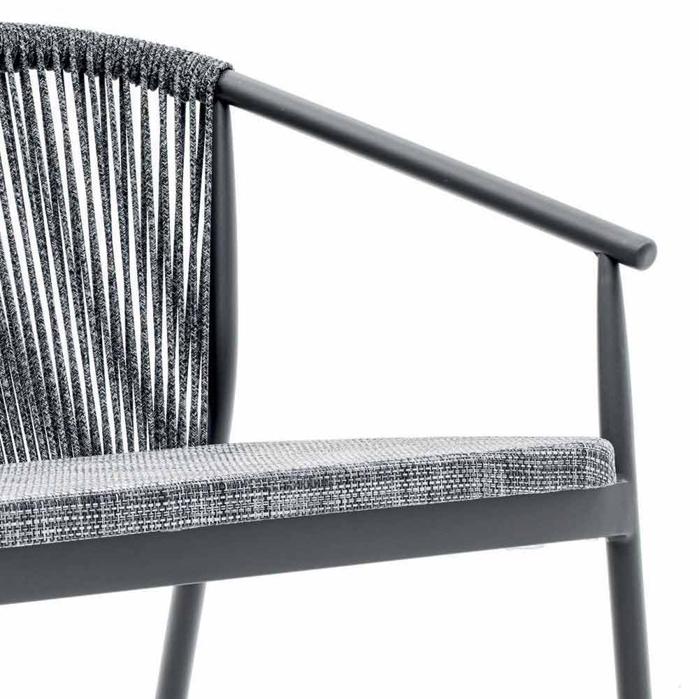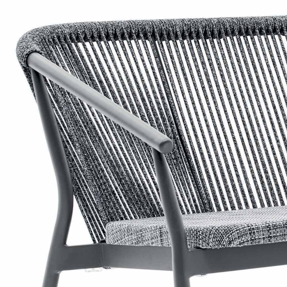 Die Verflechtung der Rückenlehne mit synthetischer Kordel VAR # TEX verbessert die Ästhetik dieses Sofas, das für Tage im Freien in Gesellschaft konzipiert wurde.