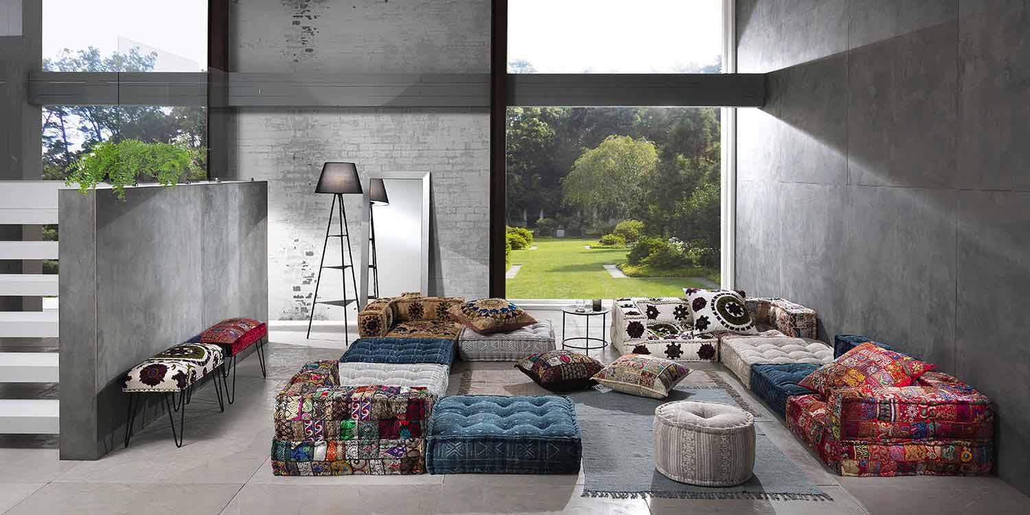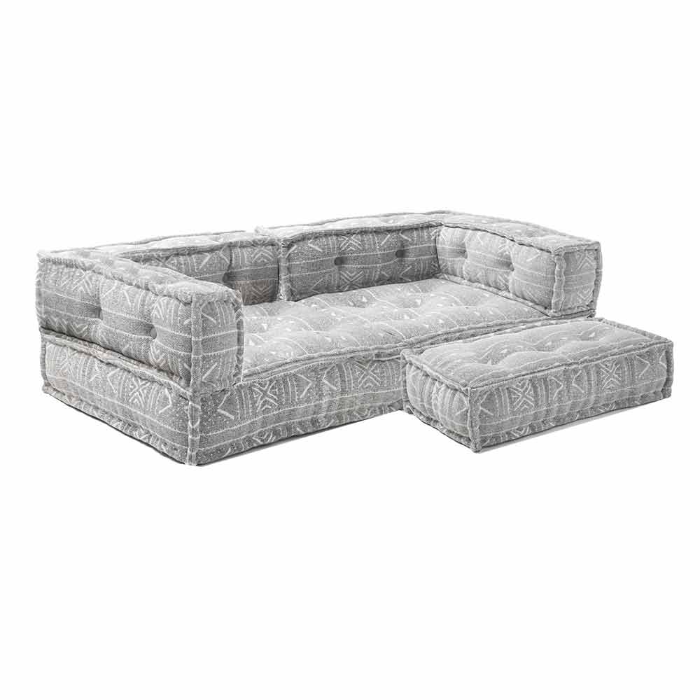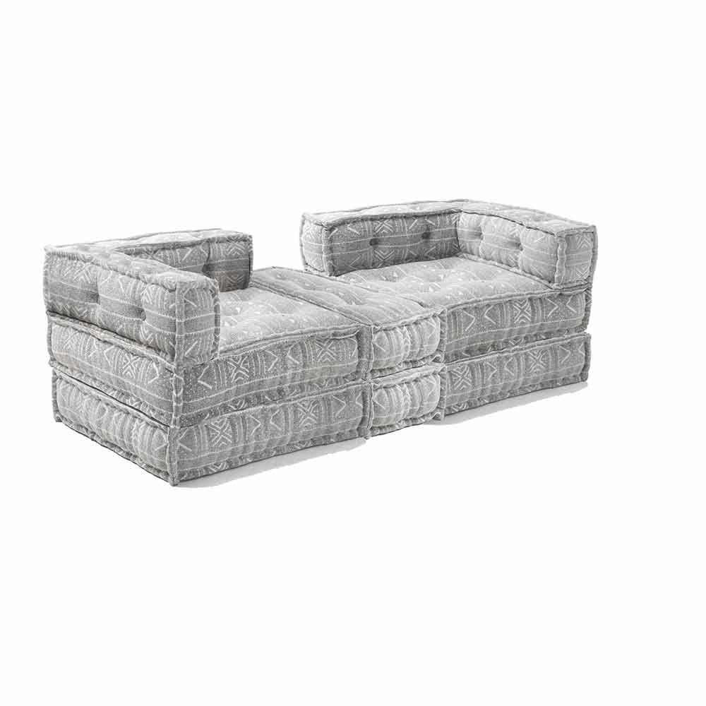 Zweisitzer-Sofa im ethnischen Design aus farbigem Stoff.
