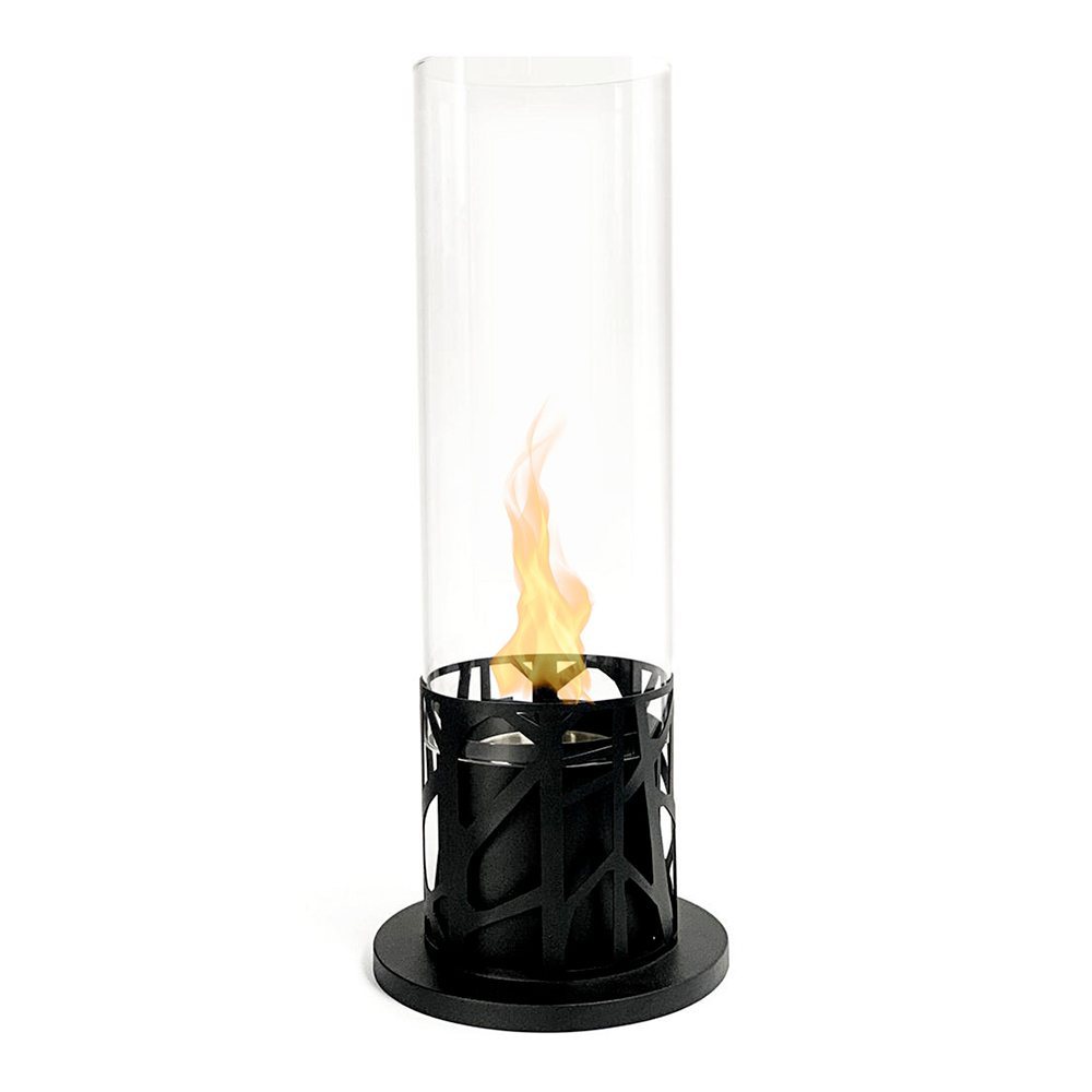 Zylindrischer Tisch-Biokamin aus gehärtetem Glas und schwarzem Metall – Ringo
